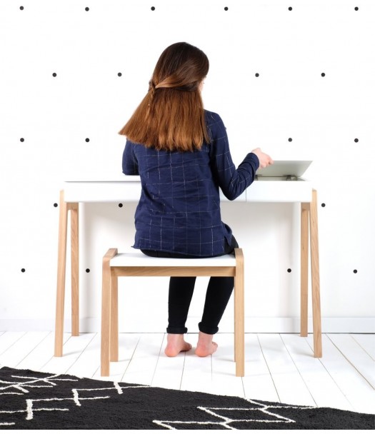 Scrivania in stile Junior bianca e legno, dalle linee contemporanee morbide e arrotondate. Combina perfettamente design e funzionalità. Amiamo i suoi due scomparti sotto il vassoio pieghevole per riporre tutto o lavorare sulla superficie piana e il suo solco per le matite. Adatto per un bambino dai 6 anni.